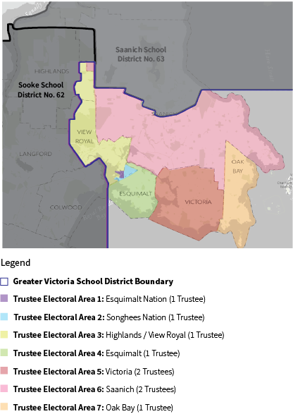 The Greater Victoria School District recognizes the letter dated March 19, 2025 from the Township of Esquimalt requesting the Minister of Education and Child Care (MOECC) to “direct School District 61 to create an inclusive and collaborative task force to consider a Trustee Electoral Area election model for the Minister’s ultimate consideration of approval for implementation in time for the 2026 Local Government/Board of Education elections.” This letter sparked additional letters of support for changes to the trustee electoral areas within the Greater Victoria School District expressed by Esquimalt Nation, Songhees Nation, and most municipalities that lie within the district. These letters are linked near the bottom of this webpage.