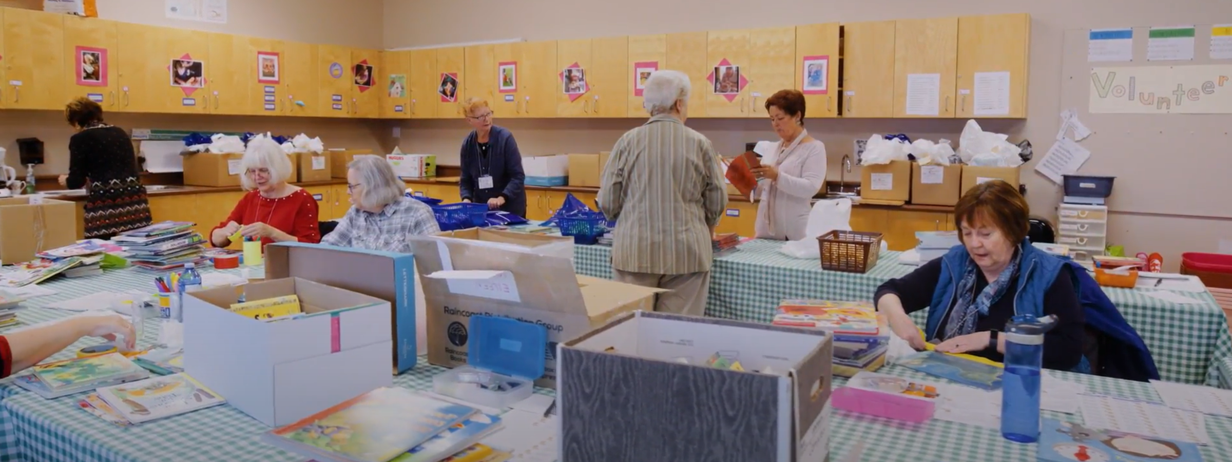 1000×5 volunteers helping clean, package, and redistribute gently used books for early readers.