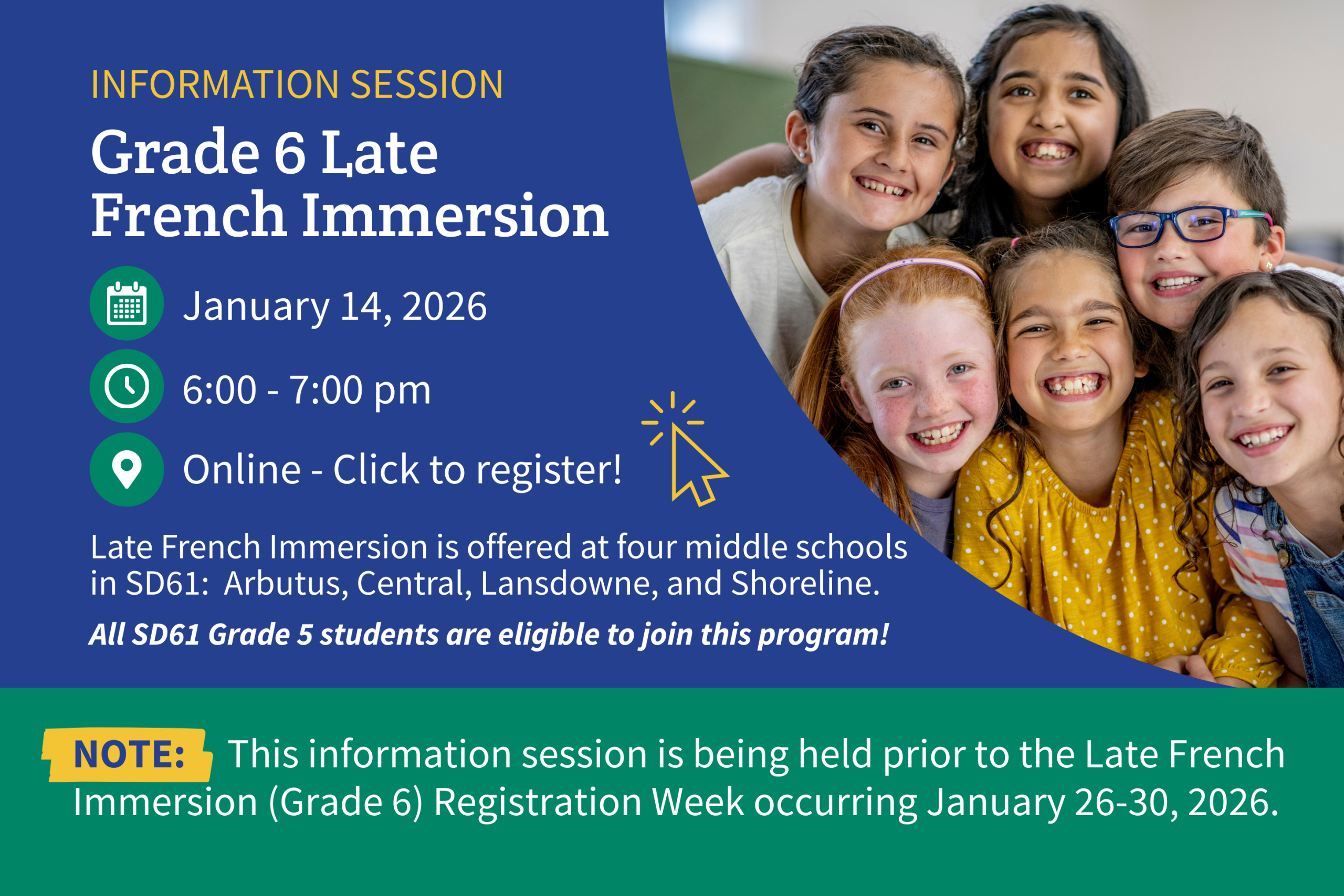 Early Immersion (Kindergarten or Grade 1) registration information can be found here and Late Immersion (Grade 6) registration information can be found here.